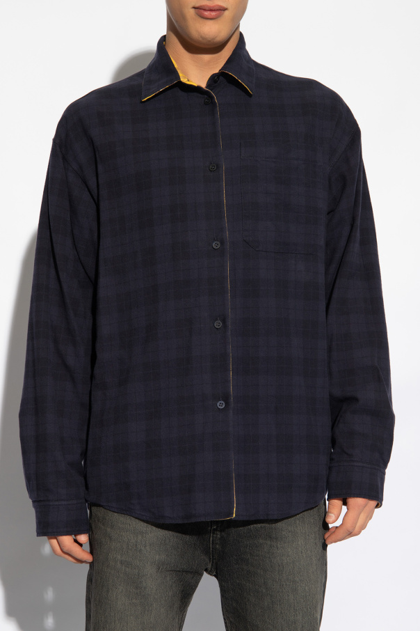Reversible shirt in yellow and purple from Balenciaga. Made from cotton and decorated with a check pattern, this style features button fastenings, long sleeves and one slip pocket. The inner side is navy blue.