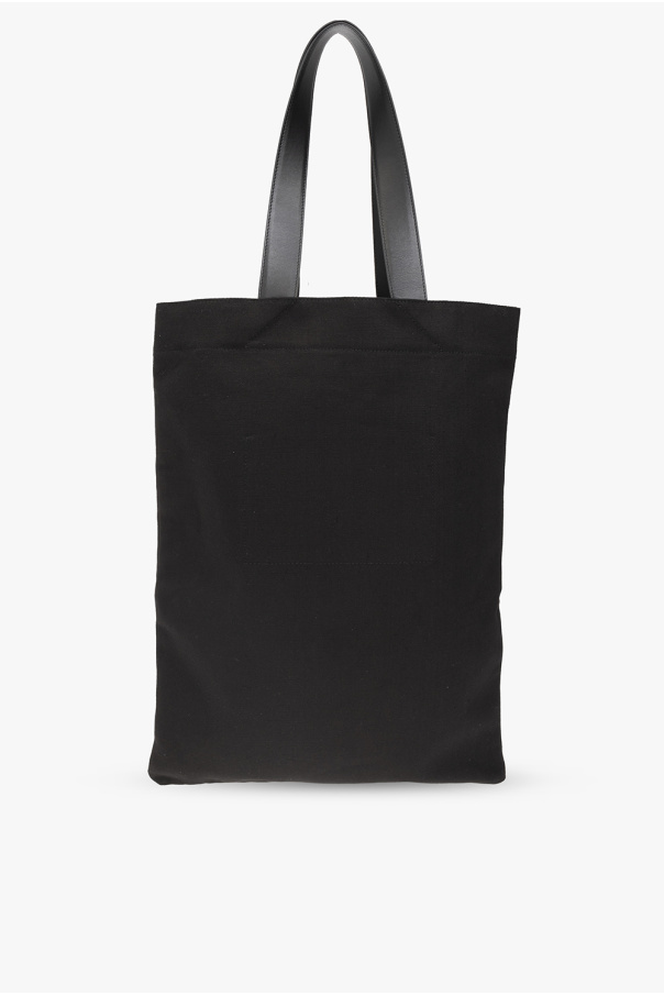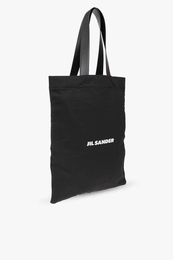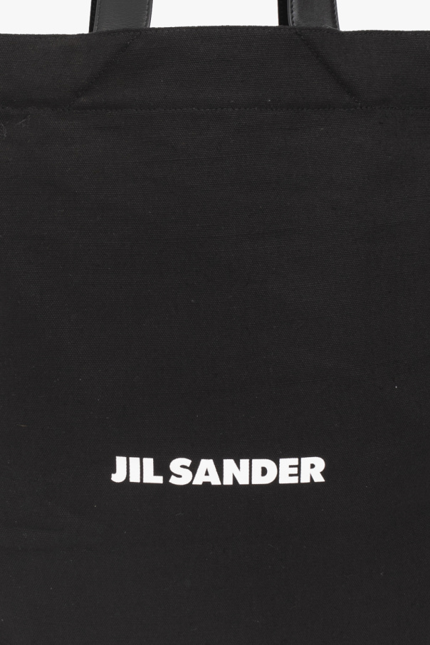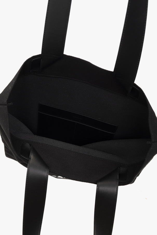 Black shopper bag from Jil Sander. Crafted from a cotton and linen blend, this model features a white logo print, two leather handles and one internal compartment with three slip pockets.