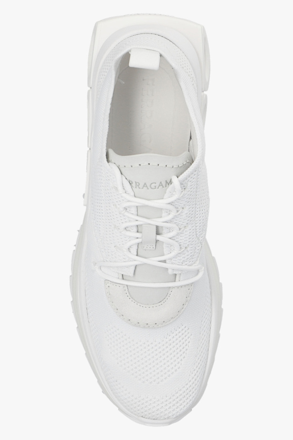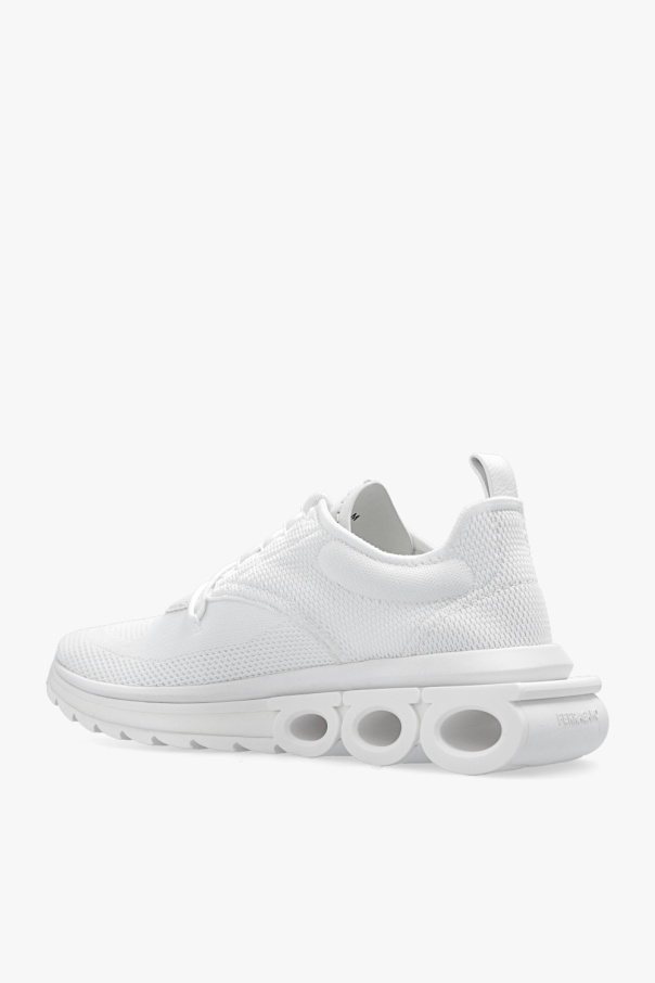 White ‘Nima’ sneakers from FERRAGAMO. Rendered in mesh, this lace-up model sits on a white rubber sole with cutout Gancini detailing and features a leather tongue.