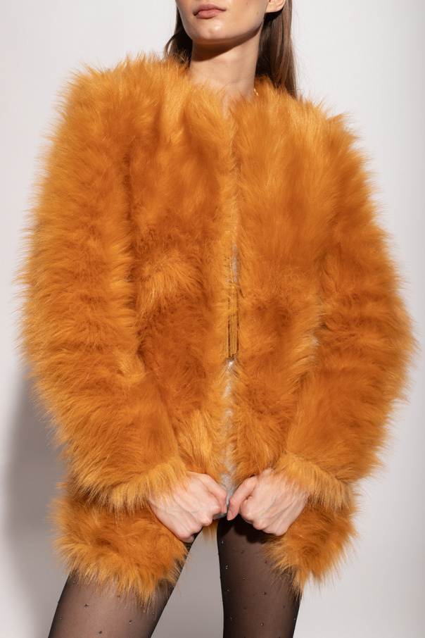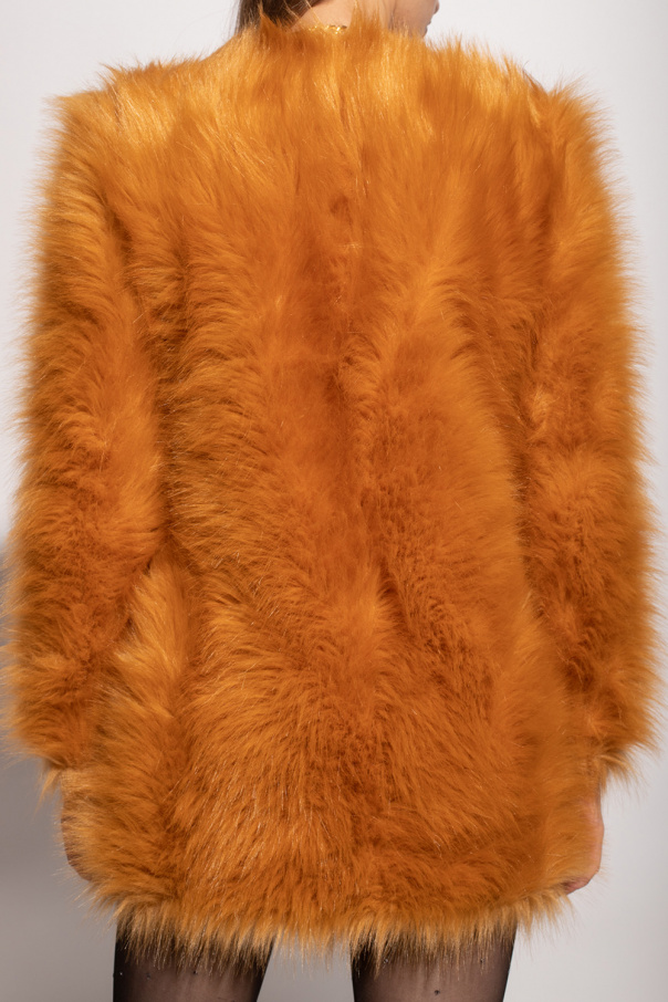 Brown and orange coat from Saint Laurent. Crafted from faux fur, this style features a round-neck collar, two side seam pockets and long sleeves.
