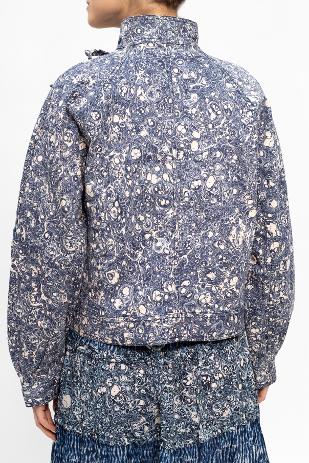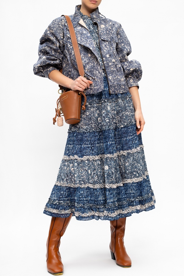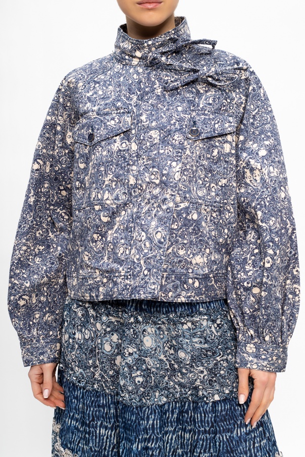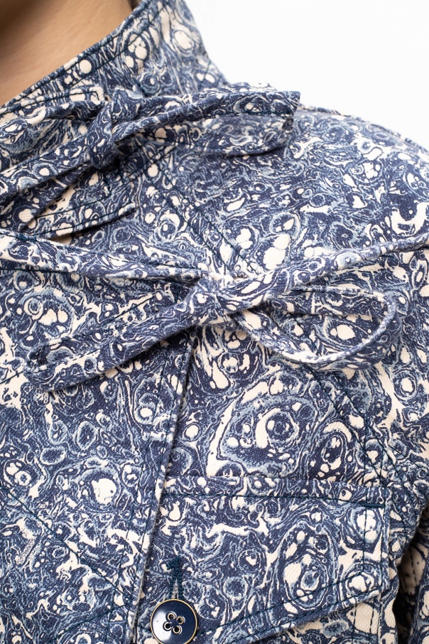 Blue and white ‘Cade’ denim jacket from Ulla Johnson. Fastened with a zip and ties, this design features a printed pattern and two front flap pockets with buttons.