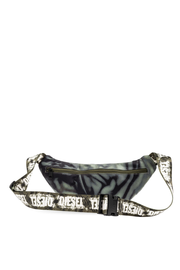 Green, black and white ‘RAVE’ belt bag from Diesel. Embellished with a logo pattern, this design features a two-way zip fastening, one back zip pocket, an adjustable strap and one internal compartment with a zip pocket.