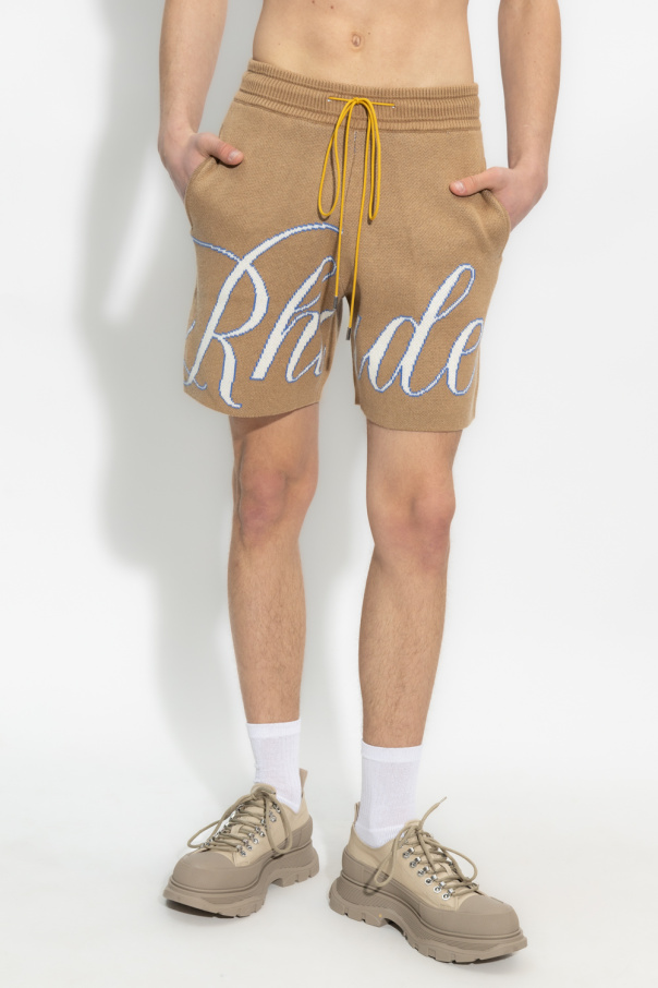 Beige shorts from Rhude. Crafted from a cotton and cashmere blend, this pair is cinched with drawstrings at the waist and features a white and blue logo and three slip pockets.