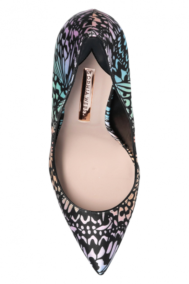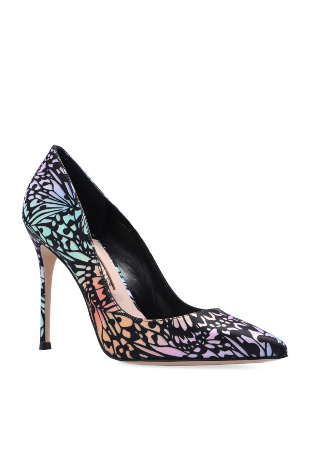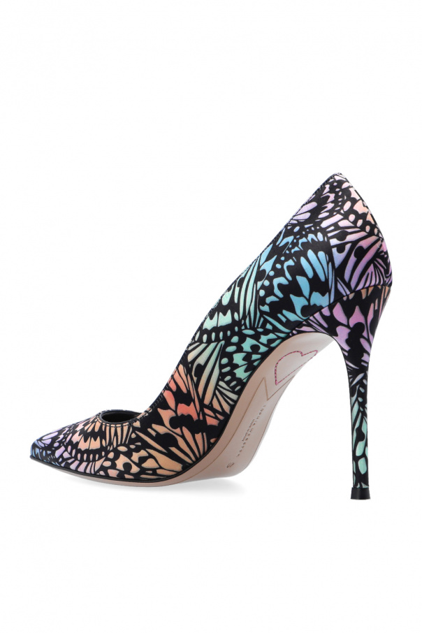 Multicolored ‘Rio’ stiletto pumps with a gradient effect from Sophia Webster. Made of fabric with a black butterfly motif, this pair rests on a beige leather sole with the label’s signature embroidered heart motif.