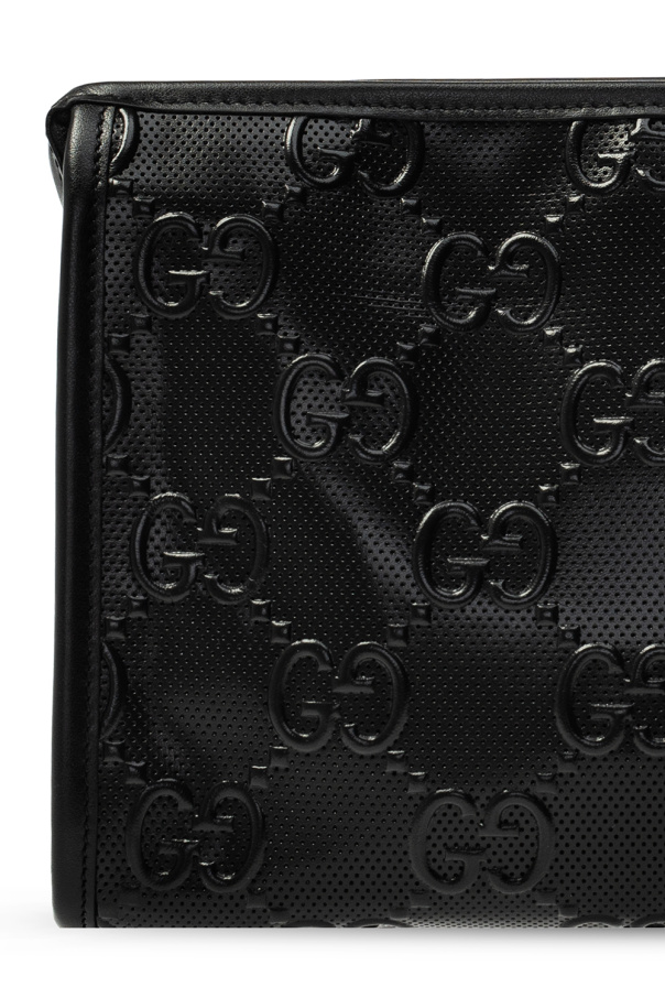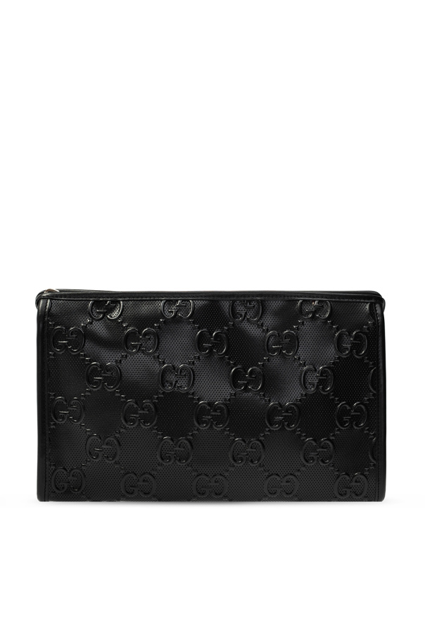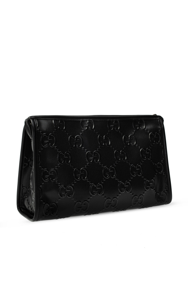 Black wash bag from Gucci. Crafted from leather with an embossed logo pattern, this piece fastens via a zip and employs silver-tone metal fittings and a canvas-clad interior with one compartment and one zip pocket.