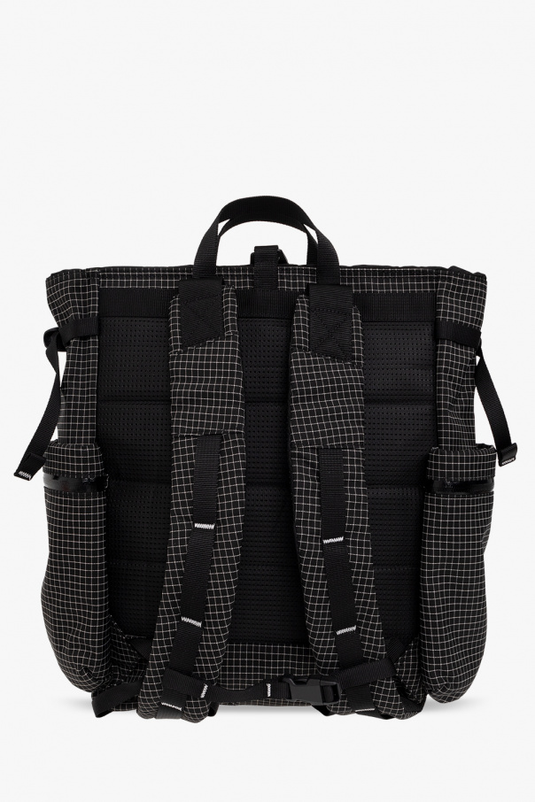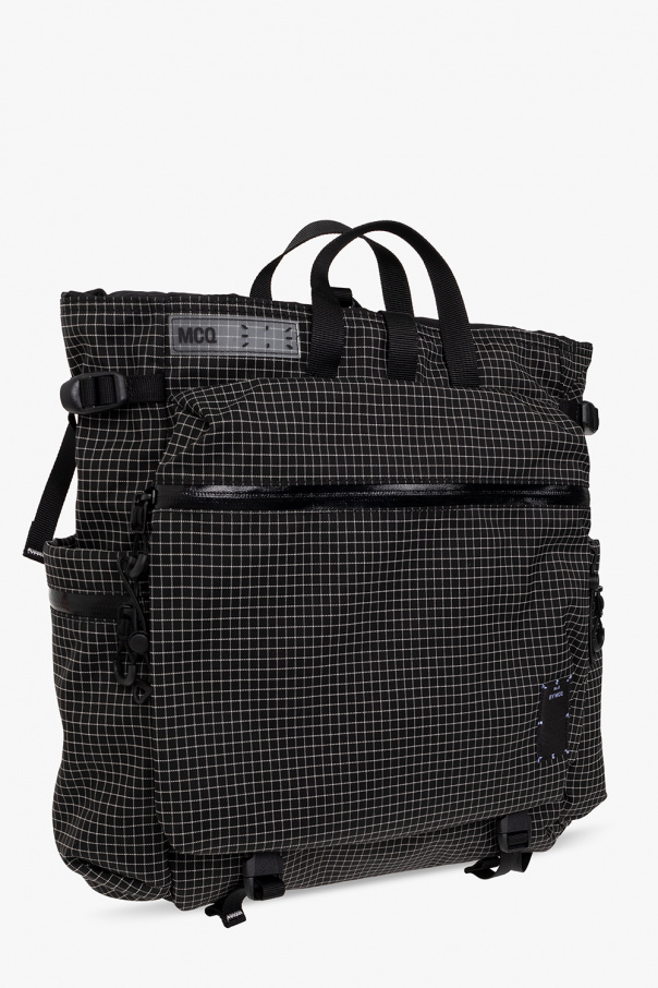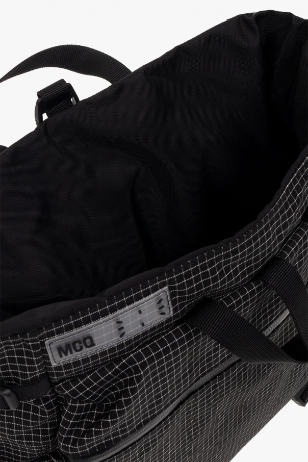 Black ‘Ico’ backpack from MCQ, the ‘No. 0’ collection. Embellished with a white check pattern, this design cinches closed with drawstrings and features a snap closure, a zip pocket accompanied by logo patches on the front, one zip pocket and one slip pocket on the sides, a half-round handle, adjustable shoulder straps and one internal compartment with a velcro pocket.