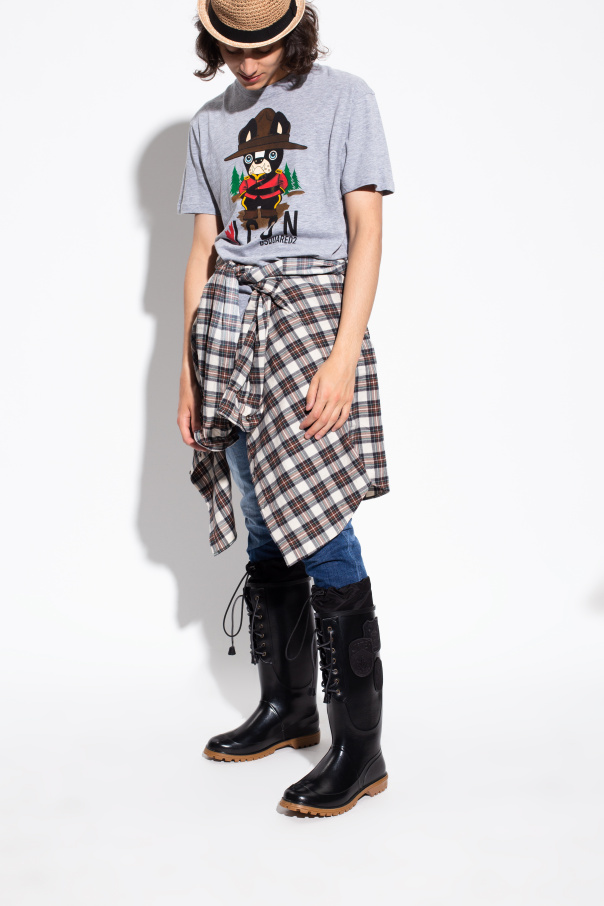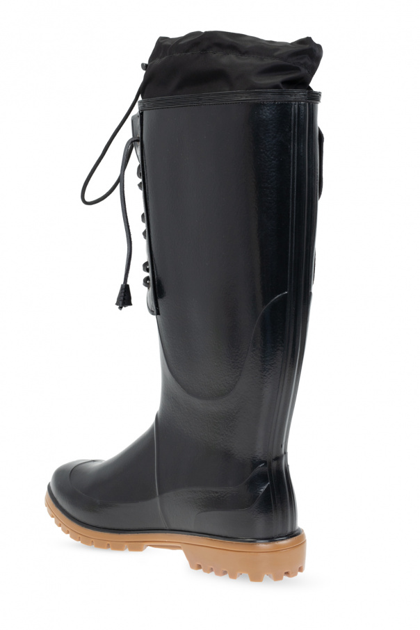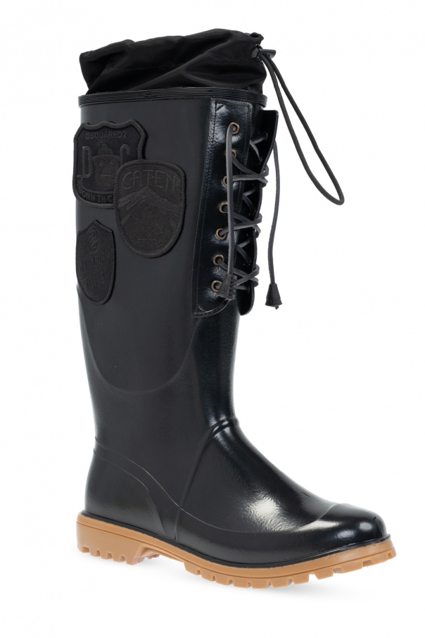 Black ‘Dook’ rain boots from Dsquared2. Set on a beige rubber sole, this lace-up pair is decorated with logo appliqués.