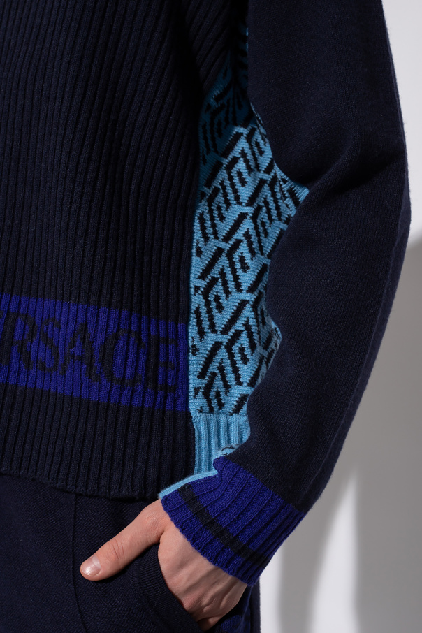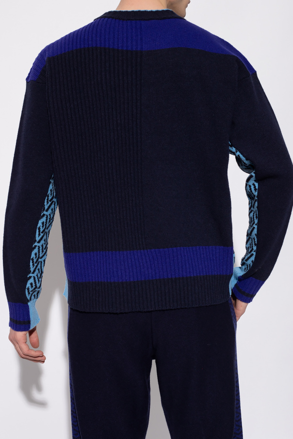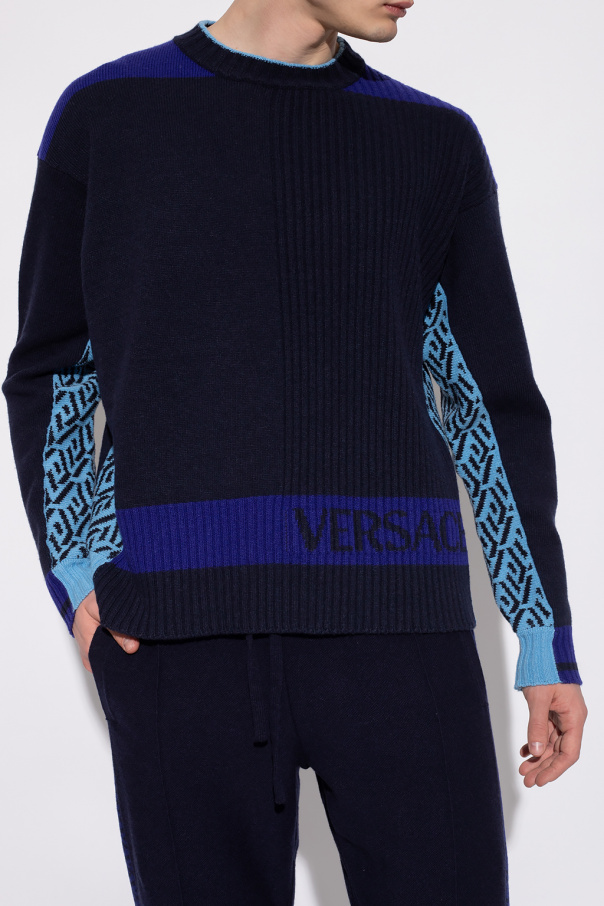 Navy and blue sweater from Versace. Crafted from a wool and cashmere blend, this round neck design is enriched by the iconic La Greca motif, logo embroidery and ribbed trims at the neck, hem and cuffs.