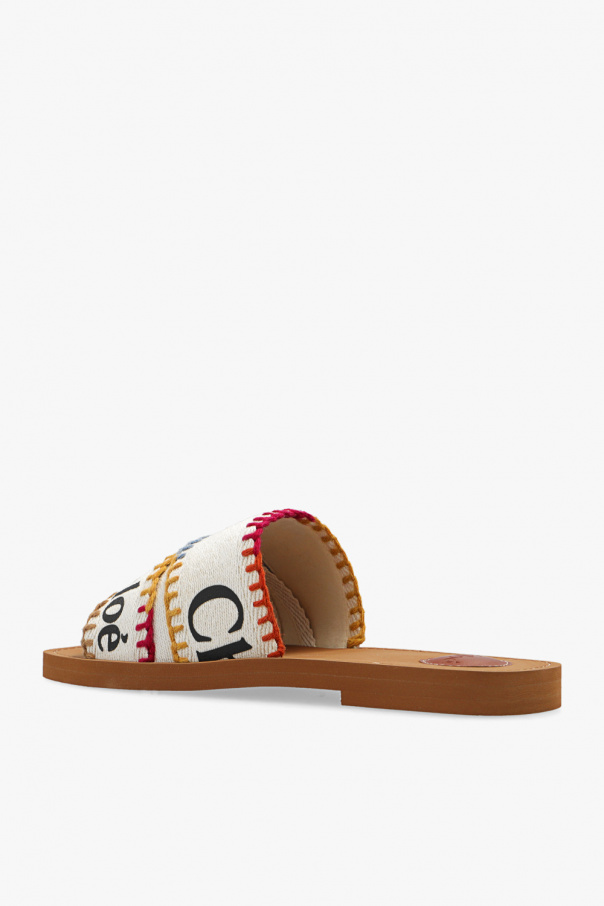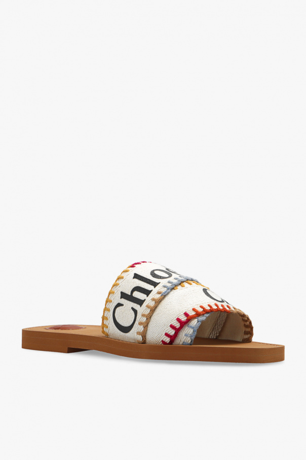 Cream ‘Woody’ slides from Chloe. Made from fabric, this model sits on a brown rubber sole and features distinctive colourful stitching details and a printed black logo.