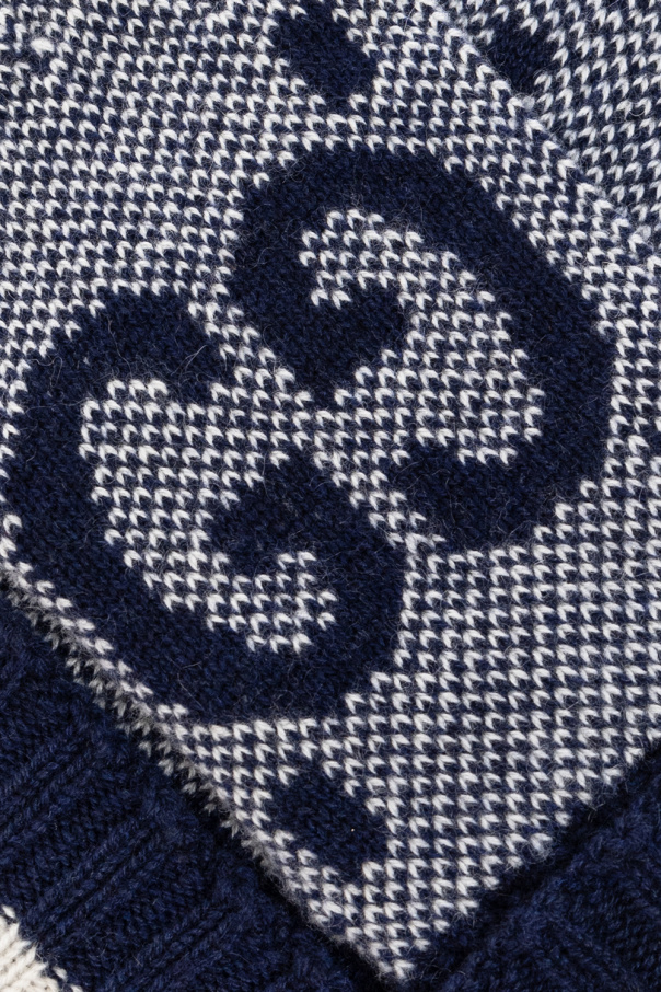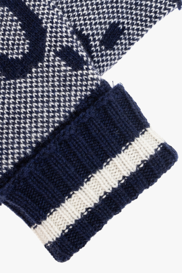 Navy blue and white fingerless gloves from Gucci. Made of cashmere, this pair showcases an embroidered monogram pattern and ribbed cuffs.