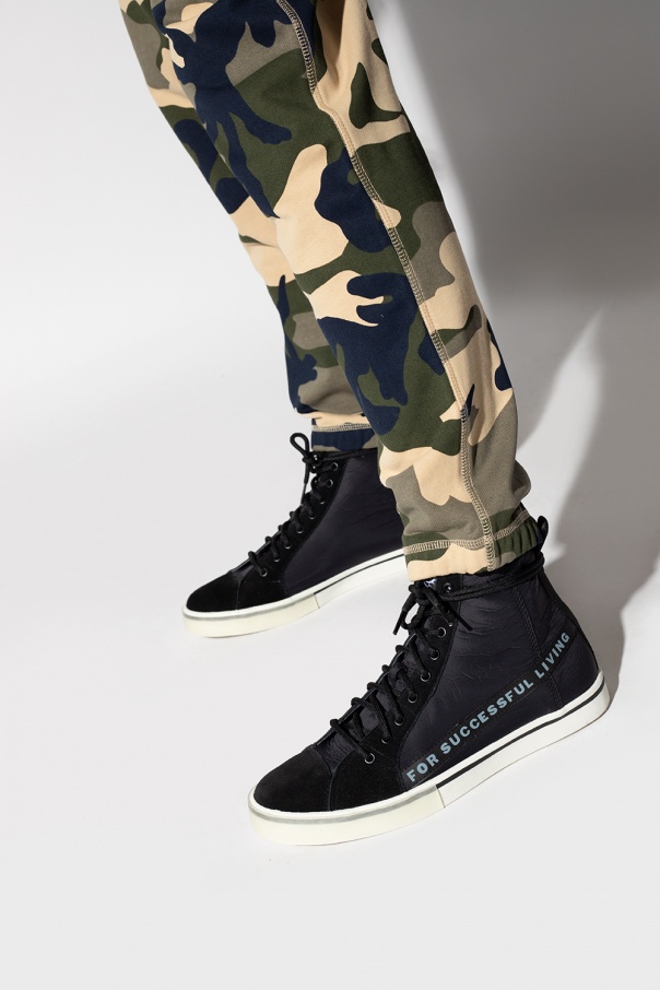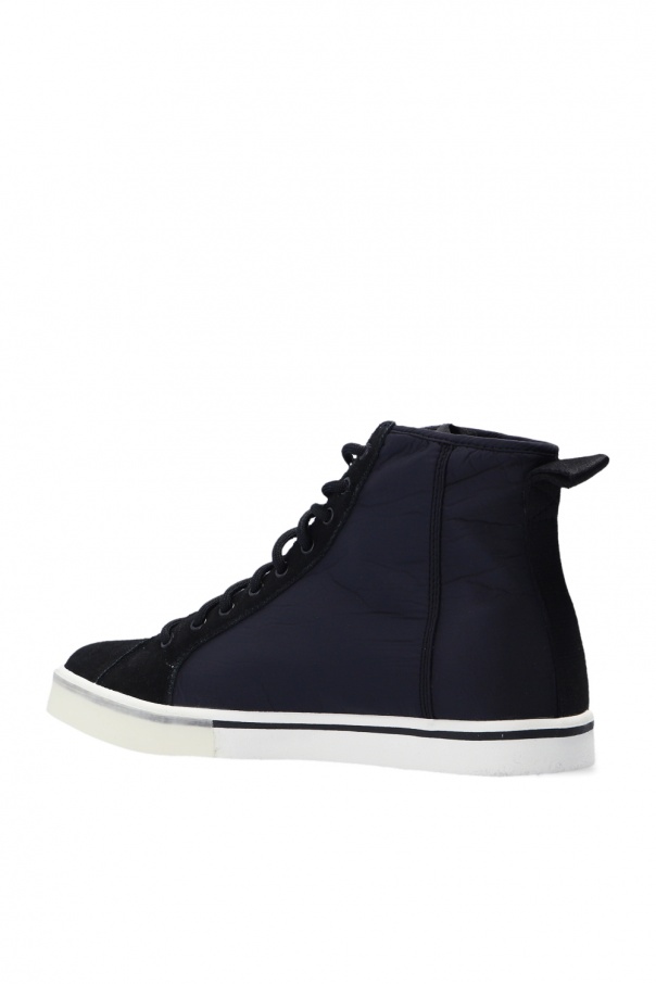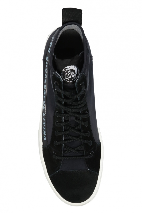 Black ‘S-Dvelows’ lace-up sneakers from Diesel. Trimmed with suede, this high-top design is complete with a logo patch on the front, light grey print on the side and rubber sole in white and black.