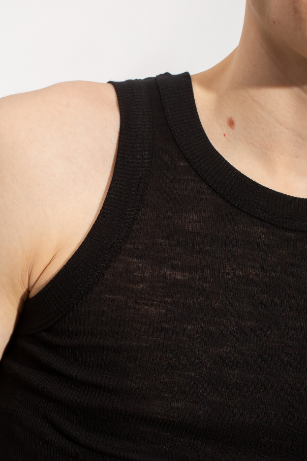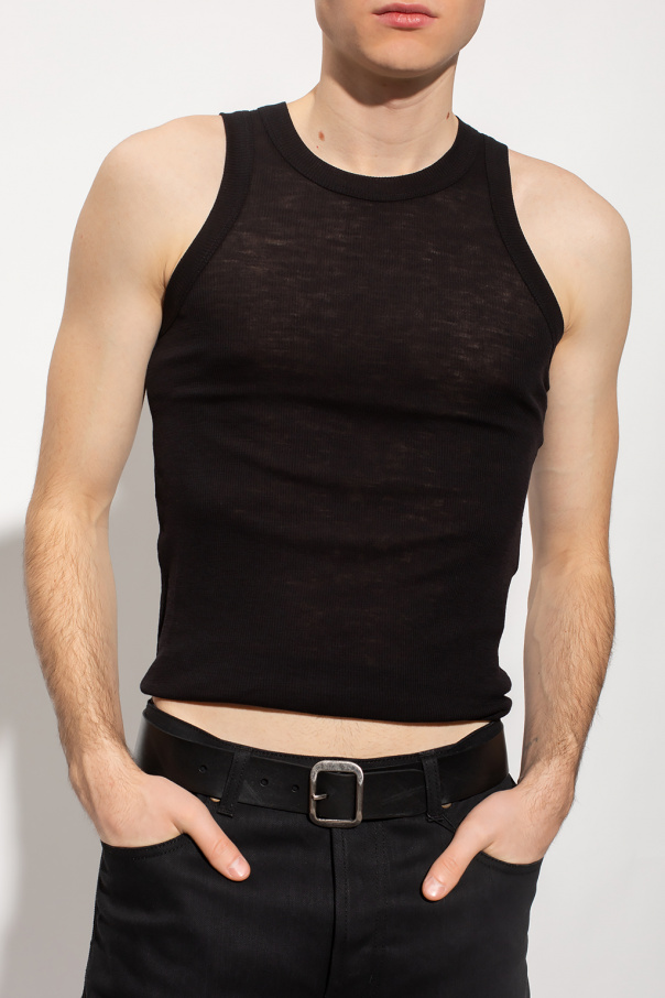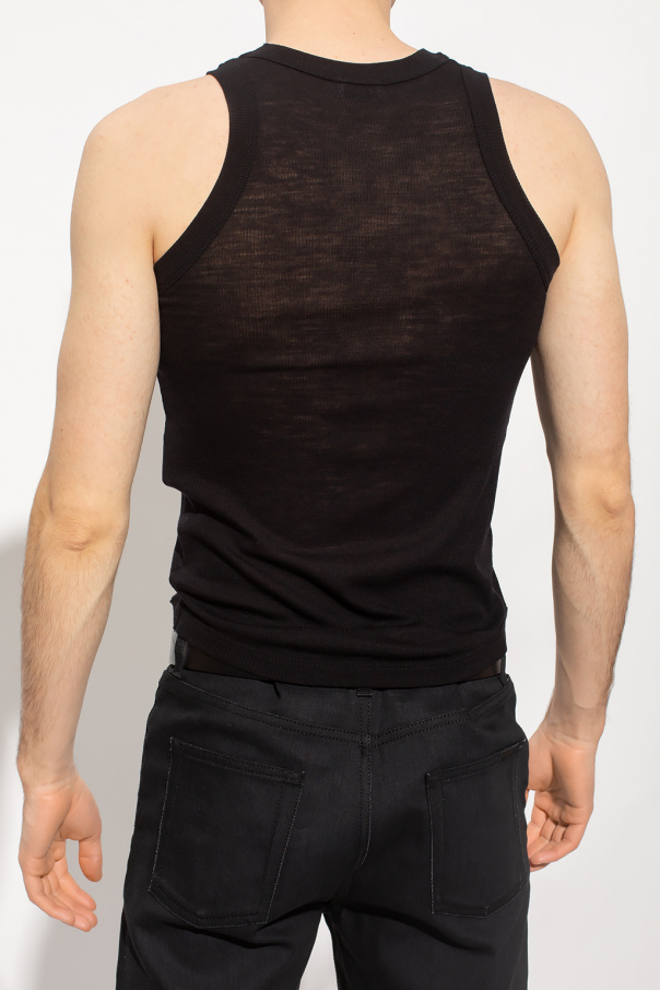 Black T-shirt from Saint Laurent. Made of wool, this style features a sleeveless silhouette with a round neck.