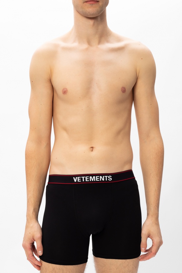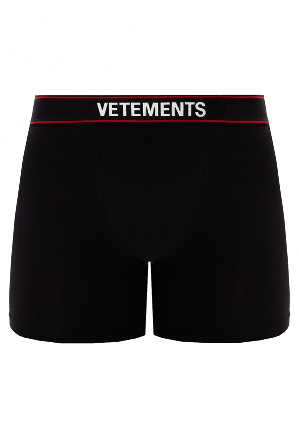 Black briefs from VETEMENTS. Crafted from cotton, this design features an elastic waistband featuring an embroidered logo pattern in white and red.