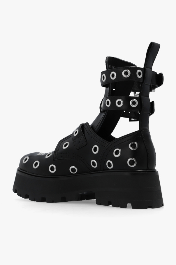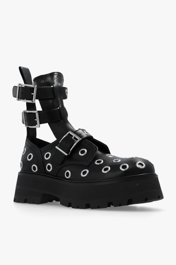 Black boots from Alexander McQueen. Made of leather, this pair features ankle straps and decorative inserts in silver-tone.