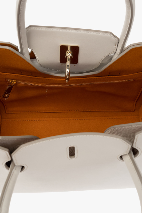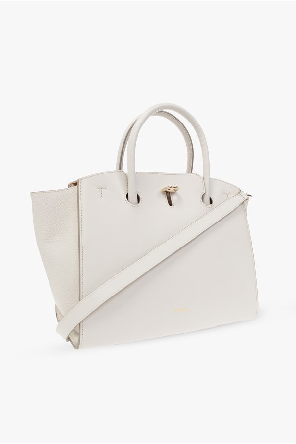 Cream ‘Genesi Medium’ shopper bag from Furla. Crafted from leather, this design secures with a twist fastener and features a printed gold-tone logo on the front. It is complete with a detachable and adjustable shoulder strap, two half-round handles, gold-tone metal hardware and one internal compartment with three slip pockets and one zip pocket.