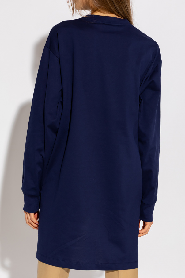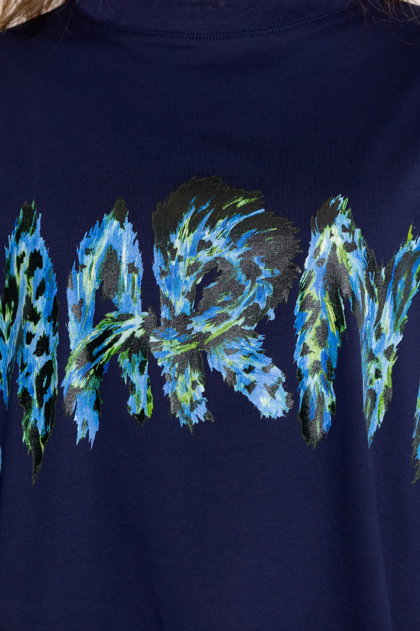 Navy blue crewneck T-shirt from Marni. Crafted from organic cotton with a relaxed fit, this style features an elasticated collar and long sleeves, a long back hem and a blue and green printed logo on the front.