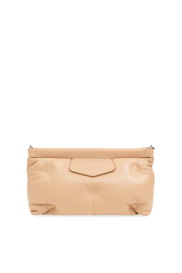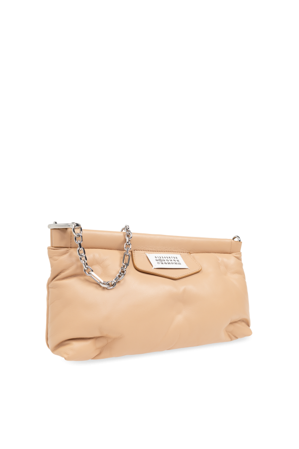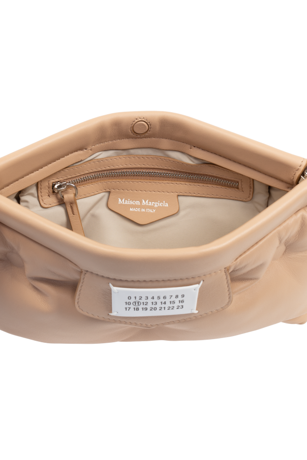 Introducing the \'Glam Slam\' Shoulder Bag by Maison Margiela, a testament to luxury and intricacy in design. Crafted from the softest leather, this large, beige, quilted masterpiece offers a sumptuous \'pillow\' feel, ensuring not just a statement piece but a treasure of comfort and elegance. The bag’s rectangular shape with rounded edges, combined with its distinctive quilting, creates an exquisite pattern that elevates its plush appearance. A rectangular, leather patch adorned with numbers from 0 to 23 on the front flap adds an intriguing, signature touch from the designer, symbolizing both identity and aesthetic appeal. Its chain strap, rendered in sophisticated silver-toned metal, enhances the bag’s refined allure, while a magnetic closure concealed beneath the flap offers effortless accessibility. The interior, lined with a material that harmoniously matches the exterior, features a brand label and an additional zippered pocket, augmenting the bag\'s functionality. This \'Glam Slam\' model melds utility with high fashion, making it a versatile accessory suitable for various occasions. Why Purchase This Product? Exquisite craftsmanship from high-quality leather ensures durability and a luxurious feel. Unique quilted design with a signature patch for an unmistakable aesthetic. Silver-toned chain strap and magnetic closure blend functionality with elegance. Ample interior with a zippered pocket for organized storage. Versatile beige color and sophisticated design suitable for any ensemble.