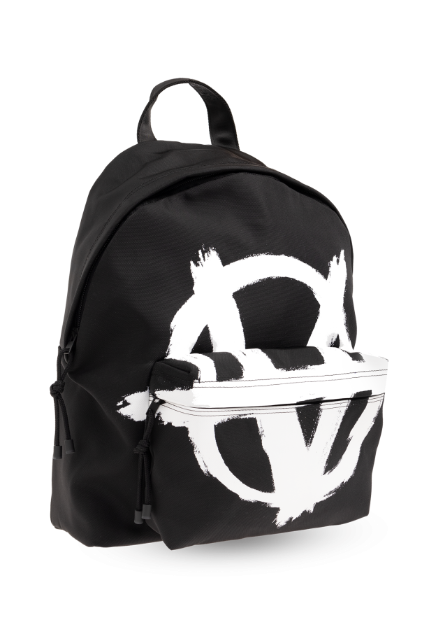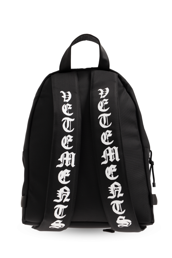 Black backpack from VETEMENTS. Fastened with a two-way zip, this design features a white logo pattern, zip pocket, half-round handle, adjustable shoulder straps, black metal hardware and one internal compartment with one slip pocket.