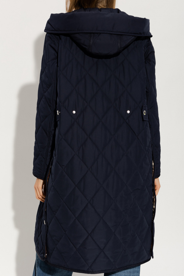 Navy blue ‘Parkgate’ quilted coat from Burberry. Fastened with a two-way zipper and a snap placket, this style features a detachable drawstring hood, three slip pockets (one is embroidered with a logo), long sleeves and snap closures on the back and sides.