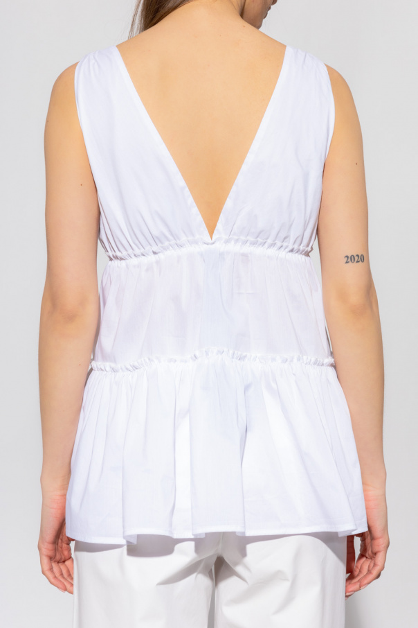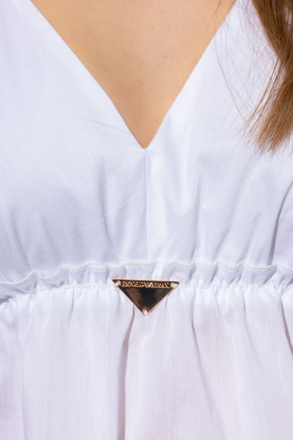 White tank top from Emporio Armani. Distinguished by gathered details, this style features a double V-neckline, a gold-tone metal logo plaque on the front and ruffles on the bottom hem.