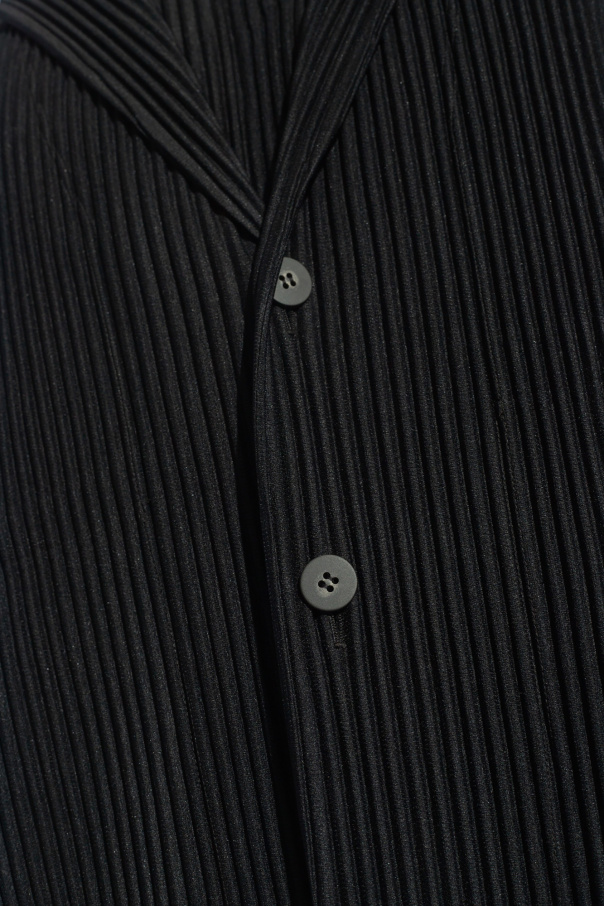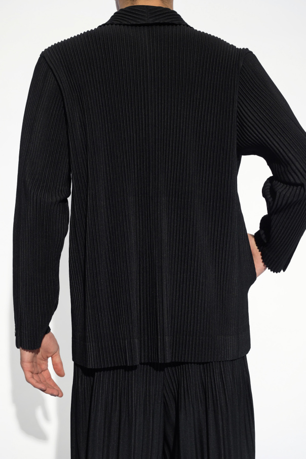 Black pleated blazer from Issey Miyake Homme Plisse. Fastened with buttons, this design features notch lapels, two slip pockets, long sleeves and a single rear vent.