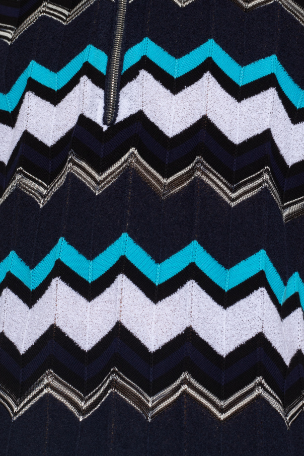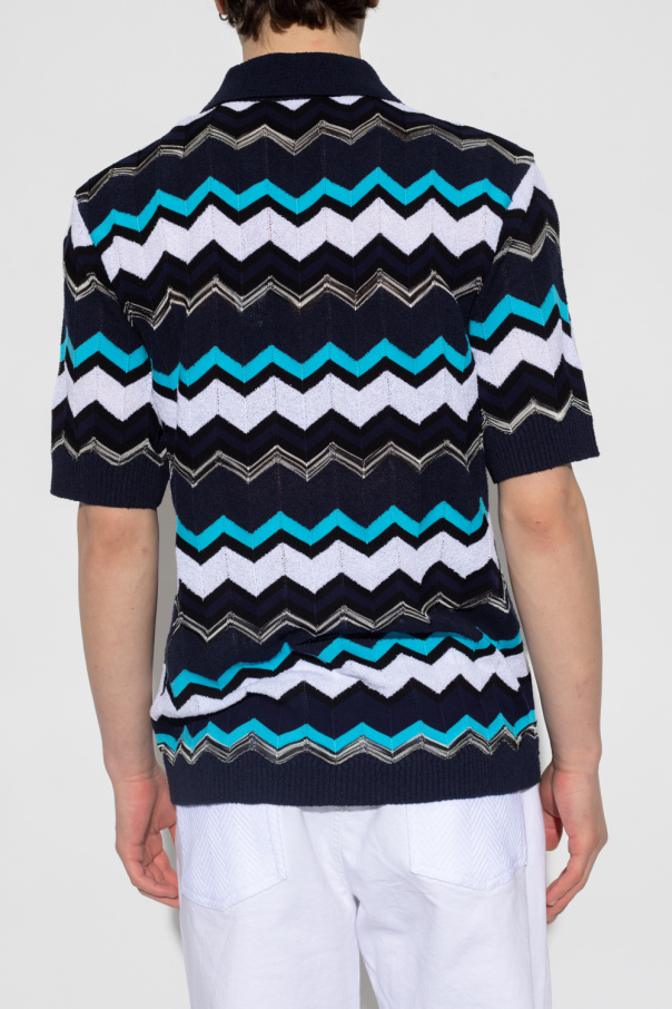 Navy blue polo shirt from Missoni. Crafted from cotton knit, this style showcases a black, white and blue pattern with the brand\'s signature zigzag motif. It is complete with a branded zipper and elasticized trims on the short sleeves and hem.
