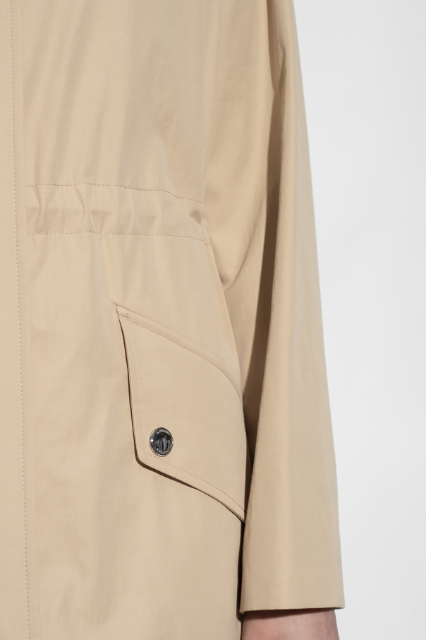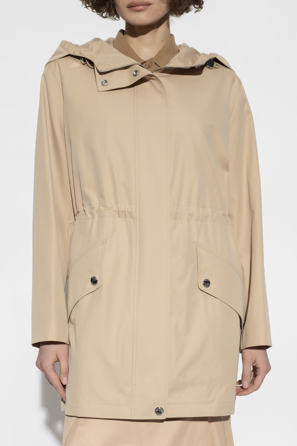 Beige coat from Burberry. Crafted from cotton, this style fastens with a zipper and snaps and features a drawcord-adjustable hood, two flapped pockets and long sleeves.