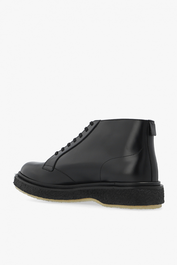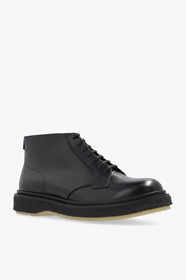 Black ‘Type 77’ ankle boots from Adieu Paris. Crafted from smooth leather, this lace-up model sits on a beige and black rubber sole.