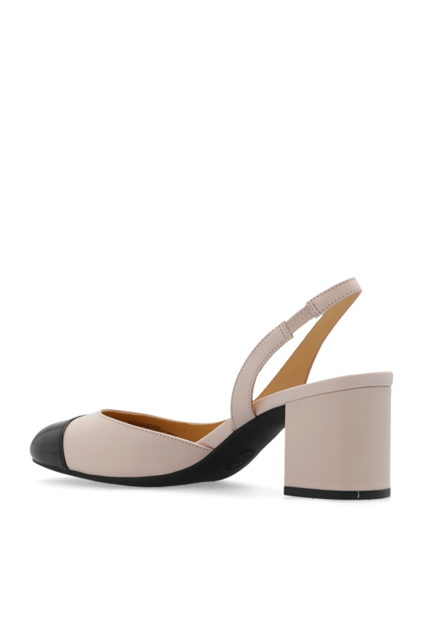 Beige and black pumps from Michael Michael Kors. Made of leather, this pair features an elastic sling back and black rubber sole.
