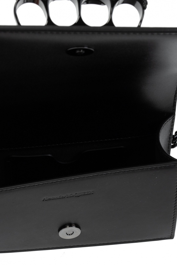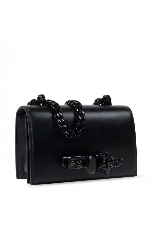 Black \'Jewelled Satchel\' shoulder bag from Alexander McQueen. Crafted from calf leather, this design fastens via magnetic snap-button and showcases the brand\'s highly recognisable knuckle duster handle bejewelled with Swarovski crystals on the front. It is complete with an adjustable shoulder strap reinforced with chain, black metal hardware details and interior with one compartment and one card slot.