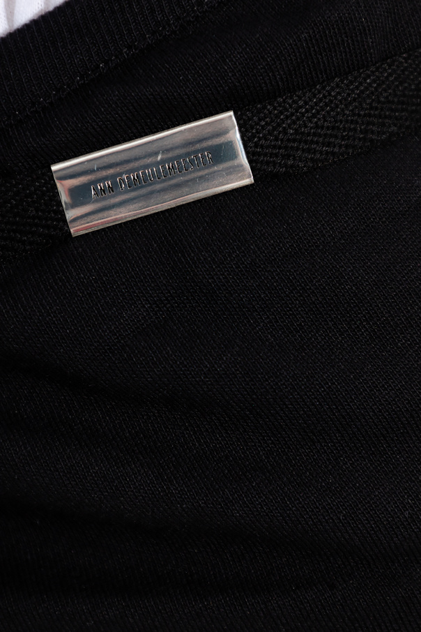Black skirt from Ann Demeulemeester. Made of cotton, this style fastens with a button and features a bottom slit for walking ease and attached the brand\'s signature straps.
