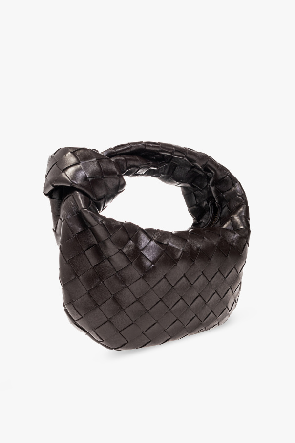 Dark brown ‘Jodie Mini’ handbag from Bottega Veneta. Crafted from a blend of lamb leather and calf leather accentuated with the brand's signature ‘Intrecciato’ weave, this design fastens with a zip and features a knotted handle, gold-tone metal hardware and one internal compartment.