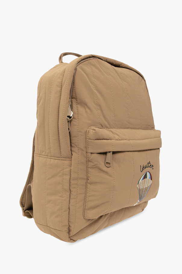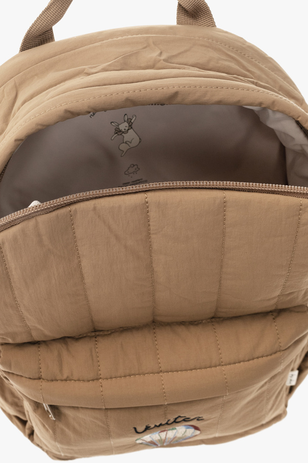 Brown ‘Juno’ quilted backpack from Konges Slojd. Made of fabric with the OEKO-TEX® certificate and a BIONIC-FINISH® ECO coating. Fastened with a two-way zip, this garment features an embroidered lettering, dinosaur motif, front pocket with zip fastening, side pocket, top handle, adjustable shoulder straps with buckles and one internal compartment with one slip pocket and two pen holders.