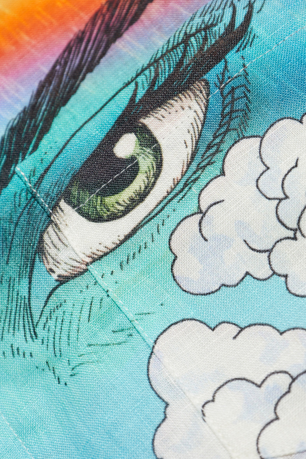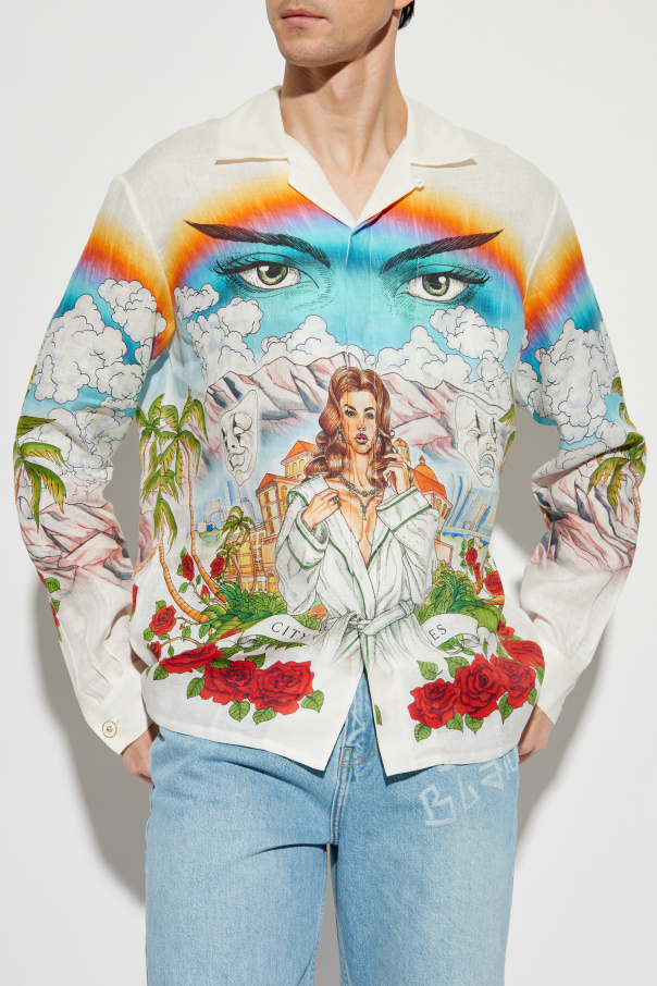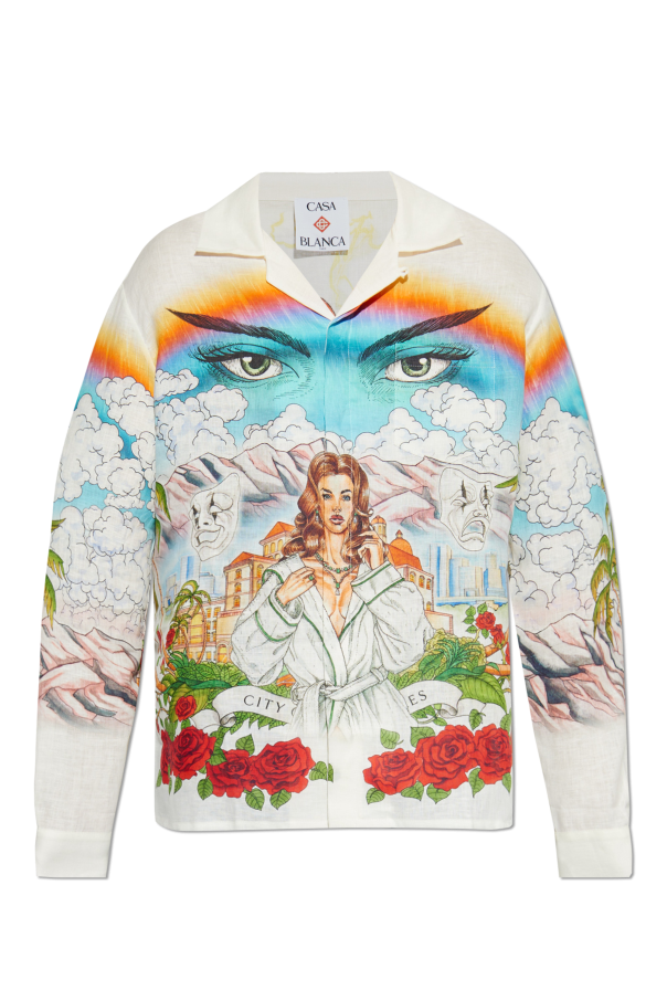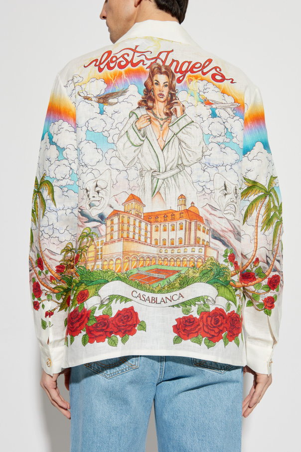 Introducing the Lniana Koszula, an exquisite piece from the illustrious collection by Casablanca. This multicolored linen shirt is a masterpiece of artistic expression, featuring a bold print that showcases a woman\'s visage against a backdrop of clouds, mountains, and architectural elements. The vibrant palette of blues, reds, greens, and oranges captivates the eye, while the back bears the inscription \"lost Angeles\" and the brand name \"Casablanca\" nestled among roses. Crafted from the finest linen, this shirt epitomizes airy sophistication with its loose fit and classic collar, marrying casual charm with unparalleled comfort. The inclusion of exotic motifs like roses and palms, along with a detailed eye pattern, further accentuates its unique and artistic allure. Why Choose This Product? Exquisite artistic design with captivating prints. Made from premium linen, ensuring breathability and comfort. Designed by Casablanca, known for luxury and elegance. Perfect for those who appreciate unique and distinctive fashion.