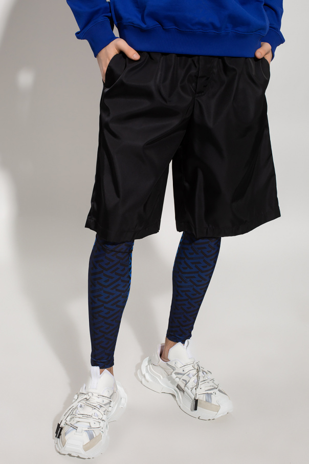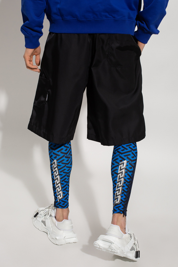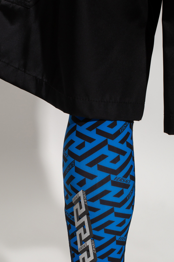 Navy blue, black and blue training leggings from Versace. Embellished with the brand\'s signature ‘La Greca’ pattern, they feature an elasticated waistband, a grey logo print and zipped cuffs.