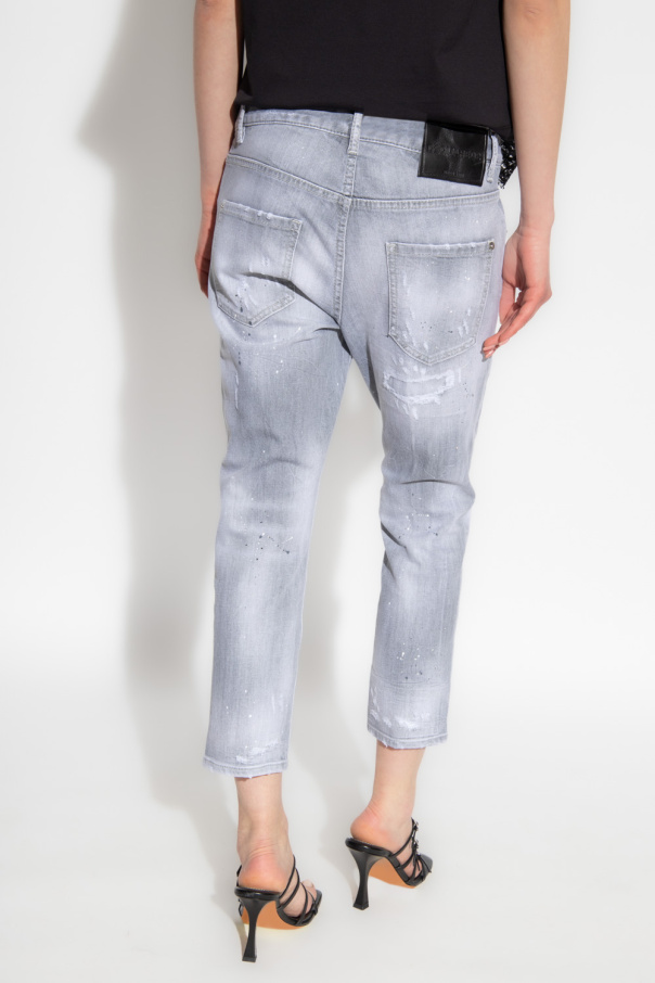 Light grey ‘Cool Girl Cropped’ jeans from Dsquared2. Falling with tapered legs, this pair features button fastenings, classic five pockets, a glossy appliqué and paint splatters.