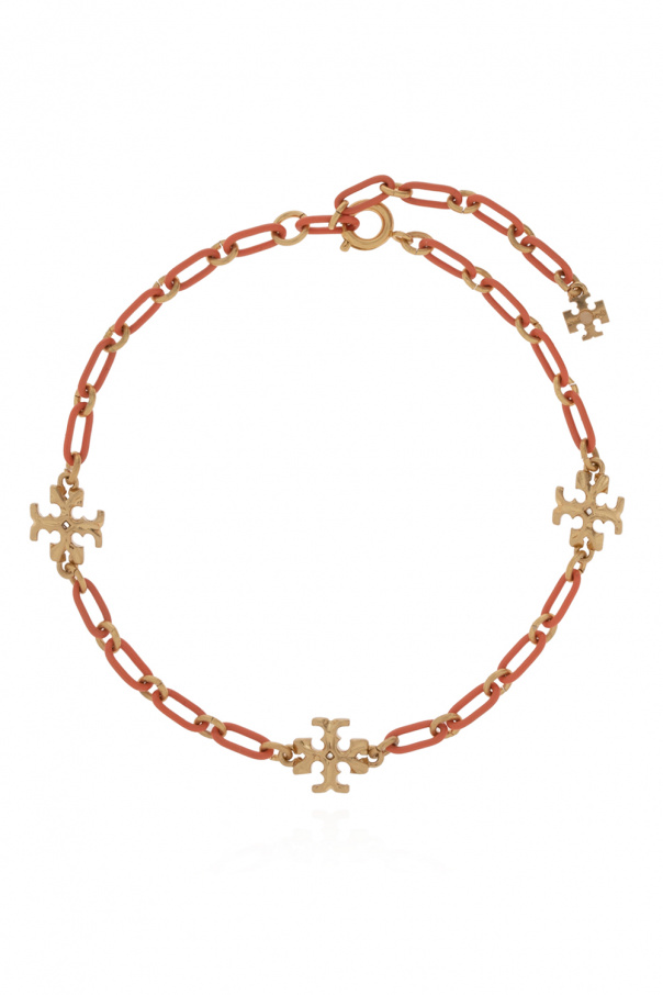 Orange and gold-tone ‘Roxanne’ bracelet from Tory Burch. Crafted from brass plated with 18k gold, this item features the label's signature Double T appliqué and a lobster clap.