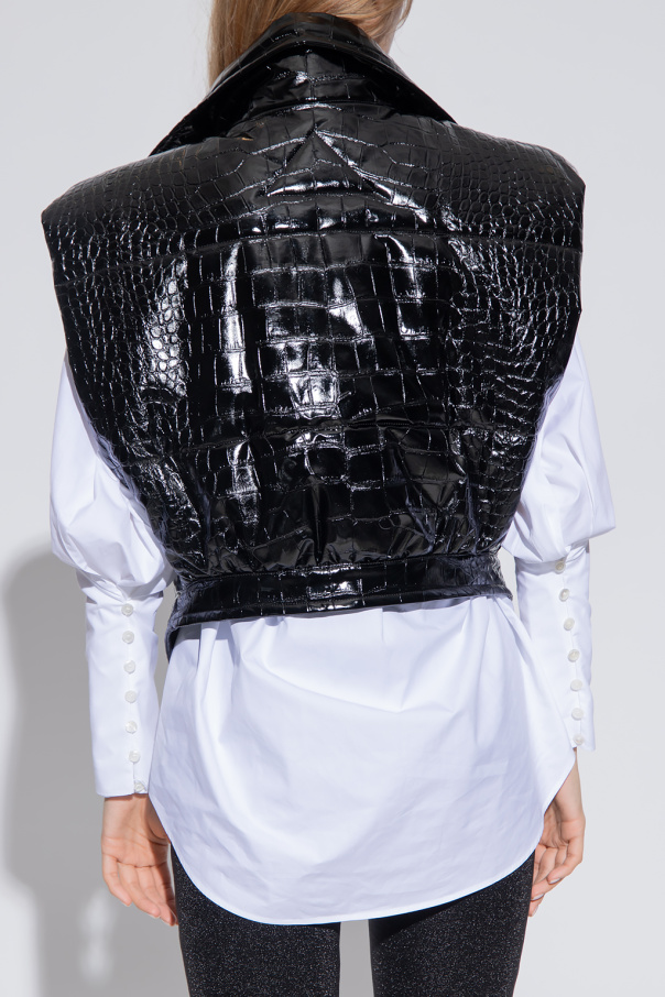 Black vest with a stand collar from Alaia. Made of faux leather with a crocodile skin effect, this model features a zip fastening, padded shoulders and asymmetric hem.