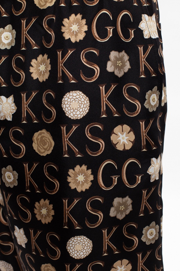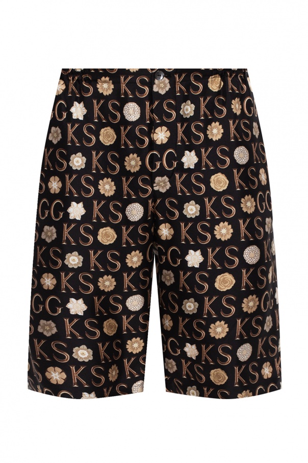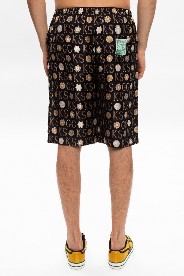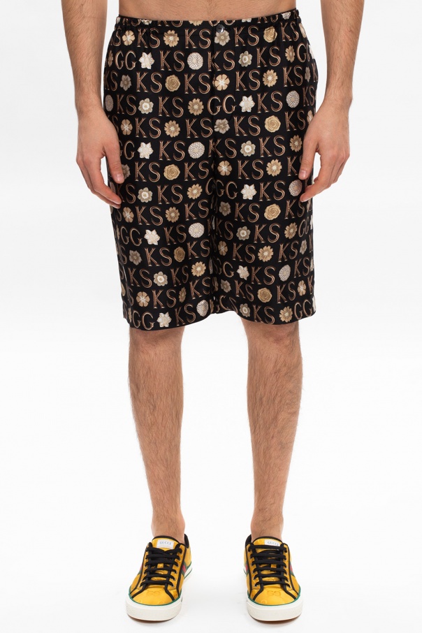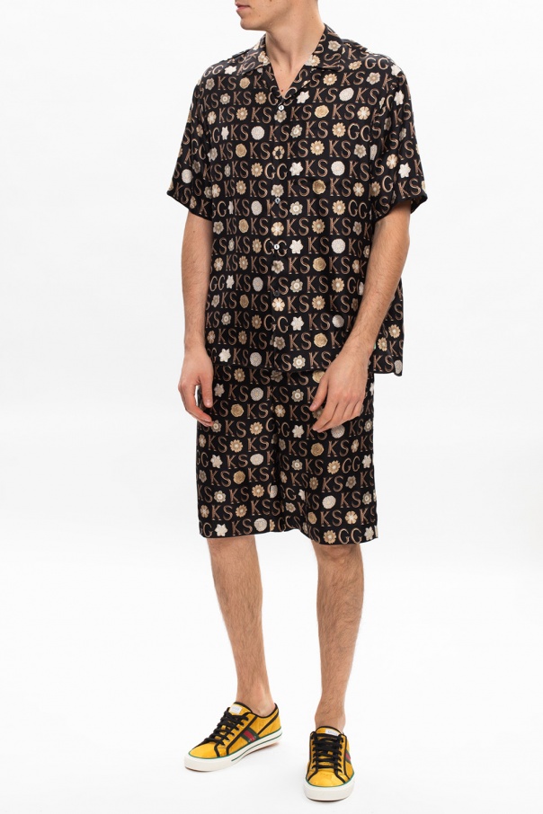 Black shorts from Gucci. Crafted from lustrous silk which was illustrated with beige and brown monogram print, this pair features knee length, button closing and two front slash pockets.