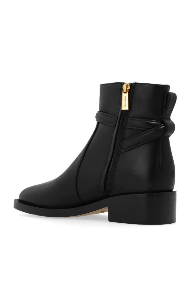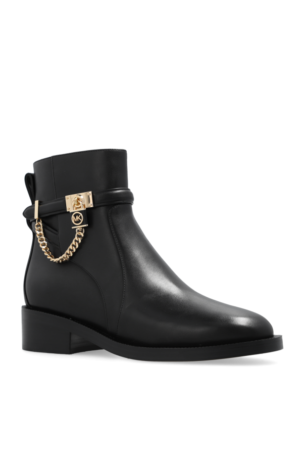 Black ‘Hamilton’ ankle boots from Michael Michael Kors. Made from leather, this model sits on a beige and black rubber sole and features a side zipper and gold-tone chain detailing accompanied by a branded padlock on a strap around the ankle.