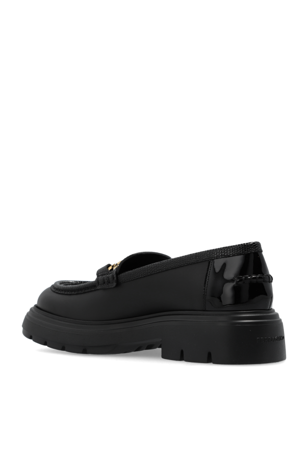 Introducing the Brooke Loafers, a paragon of sophistication and luxury. These exclusive loafers embody a timeless design with a rounded toe and a medium heel height, ensuring both comfort and stability. Crafted from the finest quality calfskin leather, the Brooke Loafers boast a smooth, glossy surface that exudes elegance. The front is adorned with a gold-toned decorative buckle, adding a touch of opulence. This buckle is robustly constructed, reflecting meticulous attention to detail. Embodying the hallmark of excellence, the interior of these loafers features the esteemed FERRAGAMO logo, affirming their heritage of luxury. The outsole is made of thick rubber, providing exceptional grip and comfort in every step. The heel\'s lacquered finish introduces a contemporary flair to the classic design. In a versatile black hue, the Brooke Loafers seamlessly complement a multitude of outfits, making them an indispensable addition to any discerning wardrobe. Why Choose This Product? Timeless, classic loafer shape with a rounded toe Medium heel height for maximum comfort and stability Premium calfskin leather with a smooth, glossy finish Gold-toned, meticulously crafted buckle for a luxurious touch Renowned FERRAGAMO branding Thick rubber sole for superior grip and comfort Lacquered heel for a modern accent Versatile black color suitable for various occasions