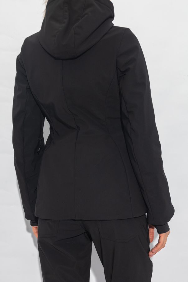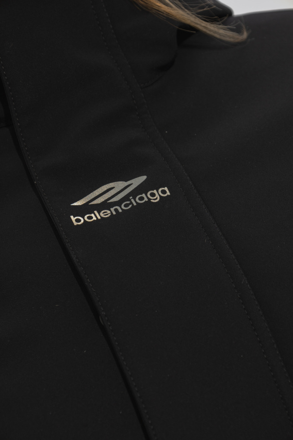 Black ski jacket from Balenciaga, the ‘Skiwear’ collection. Made of technical ripstop with waterproof membrane and tape-sealed seams and 40 gsm lightweight padded technical lining. Fastened with a zip and snaps, this form-fitting design features reflective 3B sports icon artwork printed at front and on one cuff, drawstring hood, mesh inserts with zips at the armpits, two front pockets and one pocket on the left cuff, long sleeves, storm cuffs with thumb holes and stretch finish as well as a removable elastic snow skirt.