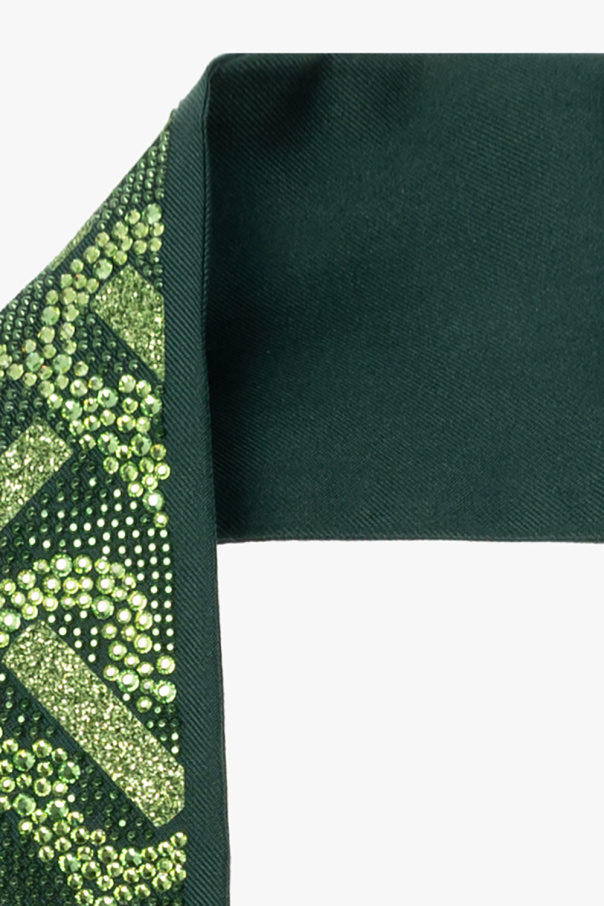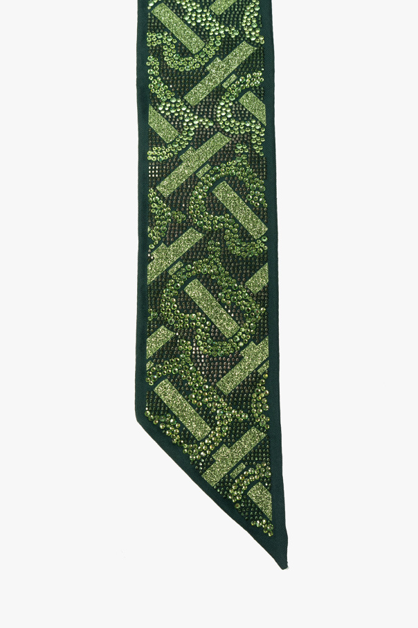 Green scarf from Burberry. Made of silk, this design features a monogram embellished with glitter and sequins.