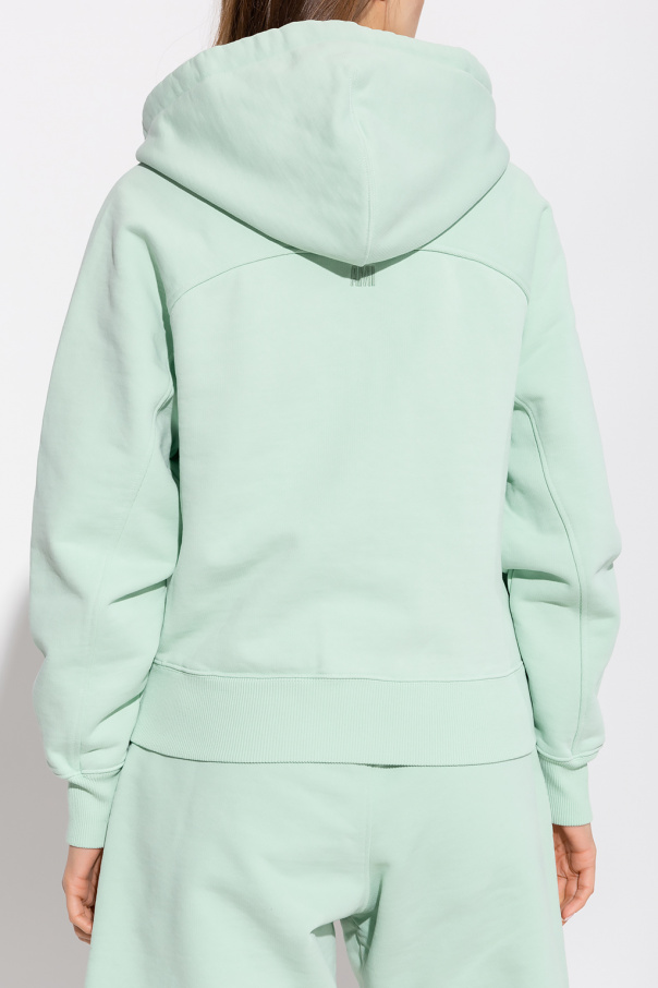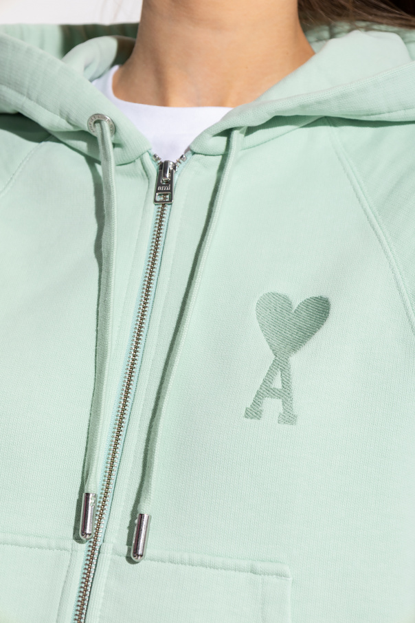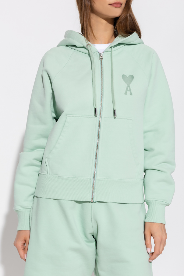 Light green sweatshirt with a drawcord-adjustable hood from Ami Alexandre Mattiussi. Crafted from organic cotton with the GOTS certificate, this style features Ami de Coeur embroidery on the front, a zip fastening, two slip pockets, raglan sleeves and a ribbed bottom hem and cuffs.
