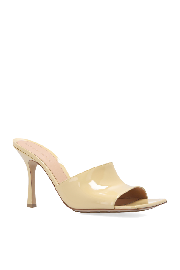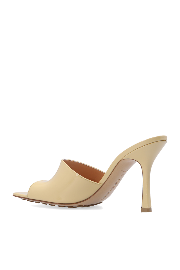 Beige ‘Stretch’ heeled mules from Bottega Veneta. Crafted from lamb leather, this pair has a square toe with a cut-out and rests on a beige rubber-injected leather outsole.