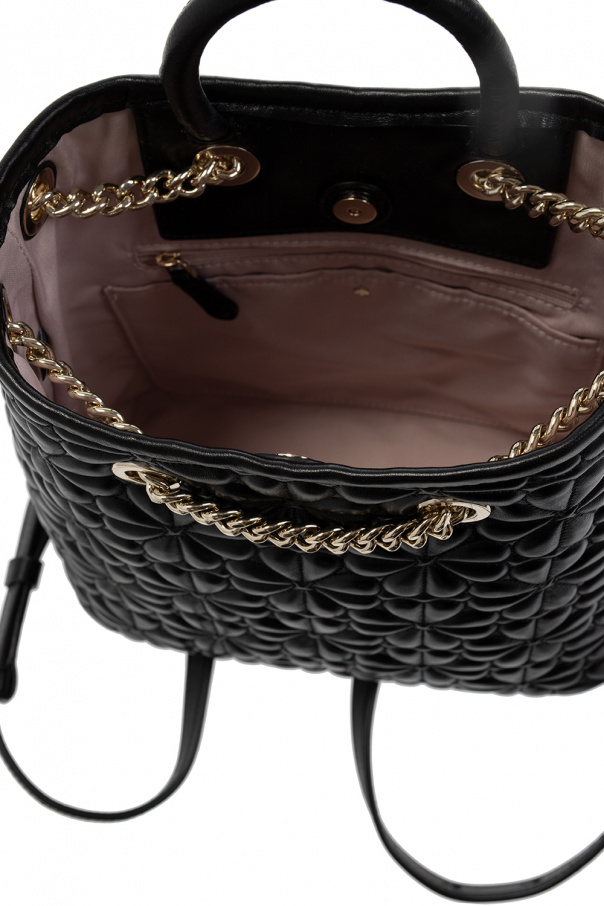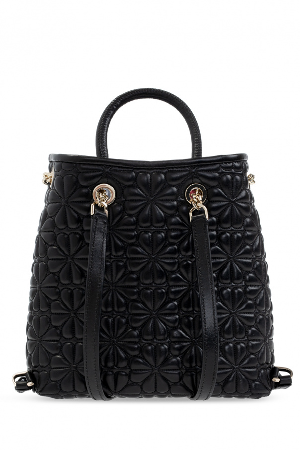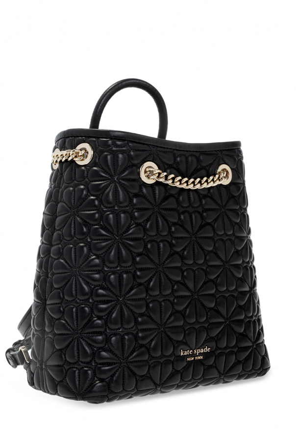 Black backpack from Kate Spade. Crafted from leather, this model fastens with a chain drawstring and is decorated with a logo and quilted details with a floral motif. It is complete with a half-round handle, adjustable straps with chain inserts, gold-tone metal hardware and one internal compartment with light pink lining, one slip pocket and one zip pocket.