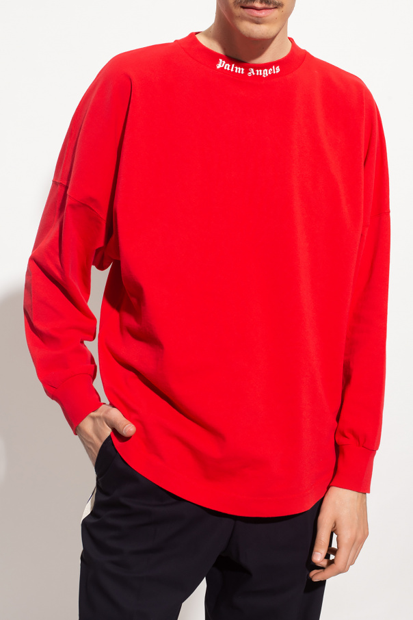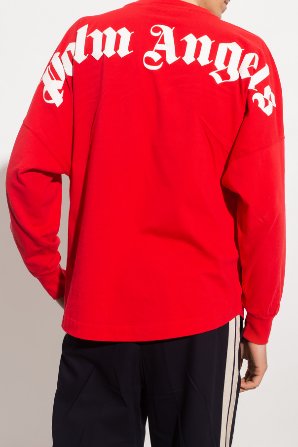 Red T-shirt from Palm Angels. Made of cotton, this long sleeve design features a white logo print and ribbed crew neck.