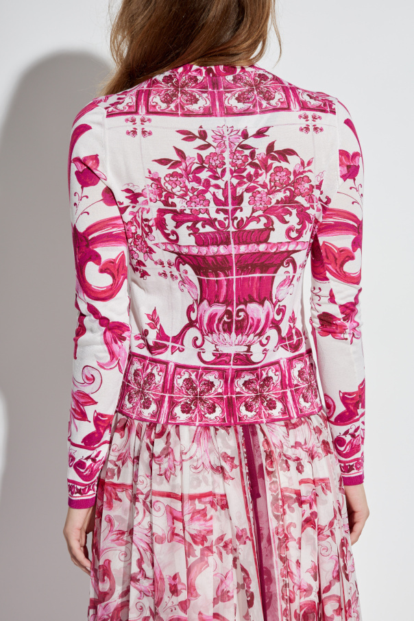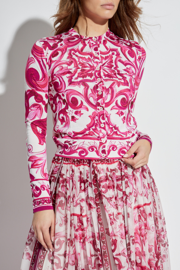 Introducing the exclusive Majolica Patterned Cardigan from the illustrious house of Dolce & Gabbana. This opulent pink cardigan, meticulously crafted from the finest silk, embodies a harmonious blend of luxury and comfort. The cardigan showcases a striking Majolica pattern in shades of pink and cream, reminiscent of decorative ceramic motifs. The symmetrical designs feature a central motif on the front, complemented by intricate adornments on the sleeves and back, adding an artistic flair to the piece. Designed with a tailored fit, this cardigan accentuates the silhouette with its long sleeves and classic, straight cut. The front is adorned with a row of delicate white buttons, aligned along the central axis, enhancing its elegance. The rounded collar further elevates its refined appearance. Notable details include the designer\'s label, prominently displayed on the inner collar, signifying the authenticity and prestige of the creation. The back boasts a large, decorative pattern depicting a floral vase motif, rendering the cardigan uniquely captivating. Why Choose This Product? Exquisite Majolica pattern for a distinctive, artistic look. Crafted from luxurious 100% silk for unparalleled comfort and quality. Tailored fit with elegant design details. Exclusive creation from the renowned Dolce & Gabbana. Perfect for creating sophisticated, standout ensembles.