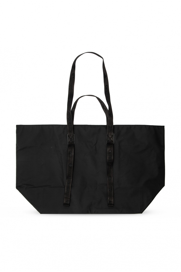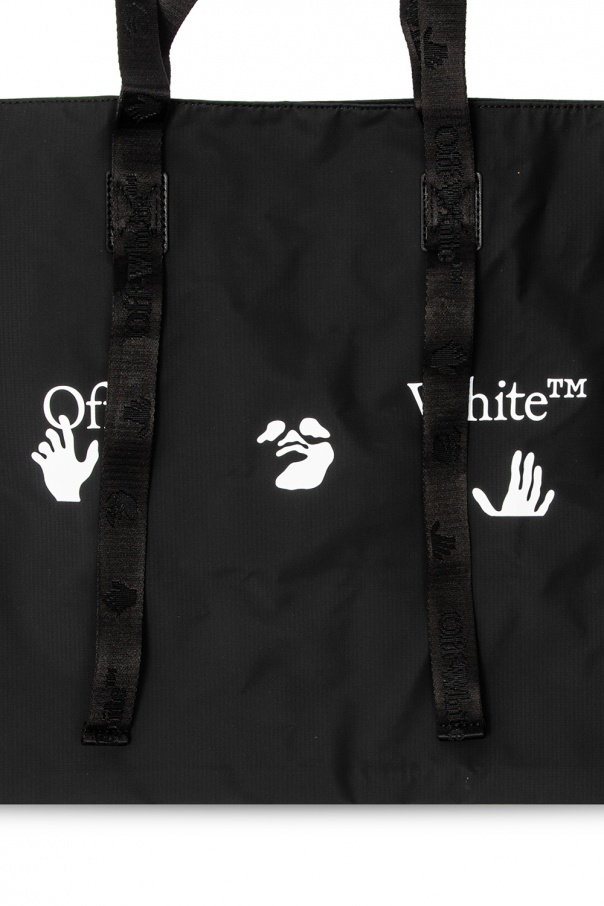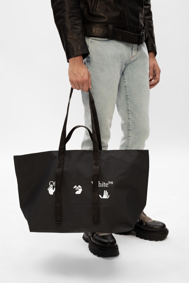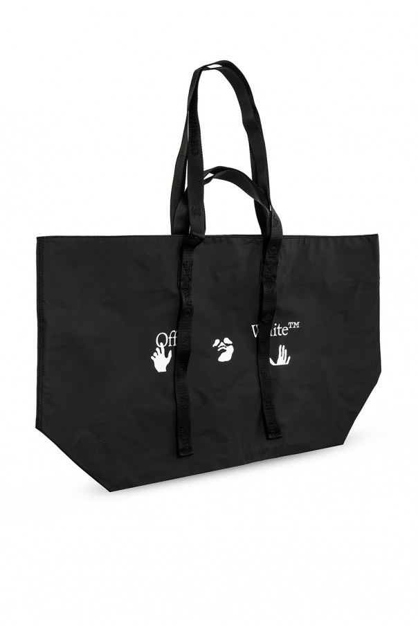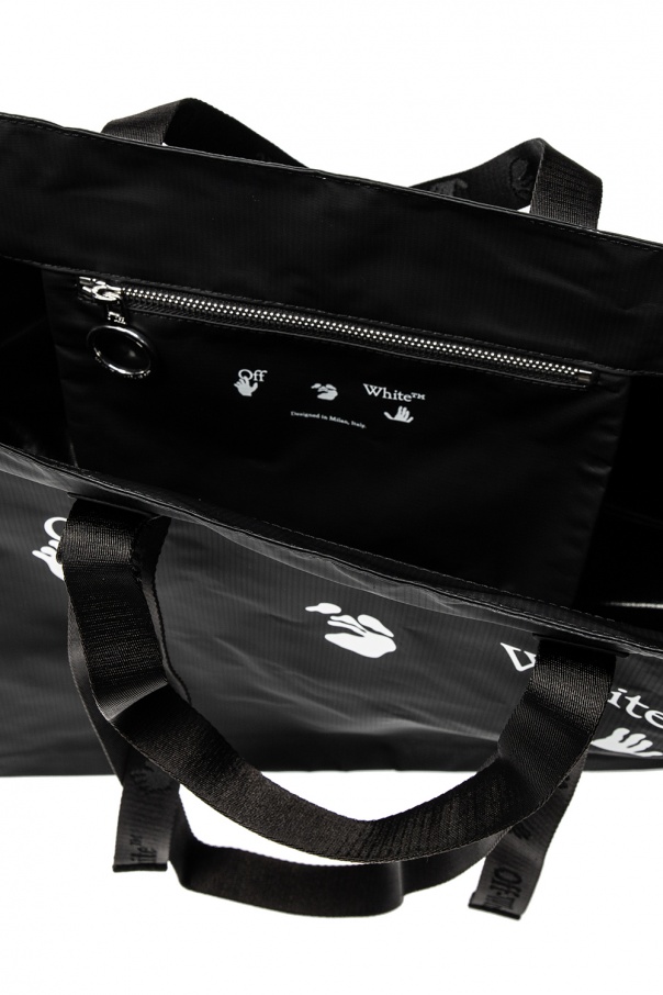 Black shopper bag from Off-White. This model features a white print, four half-round handles and a main internal compartment with one zip pocket.
