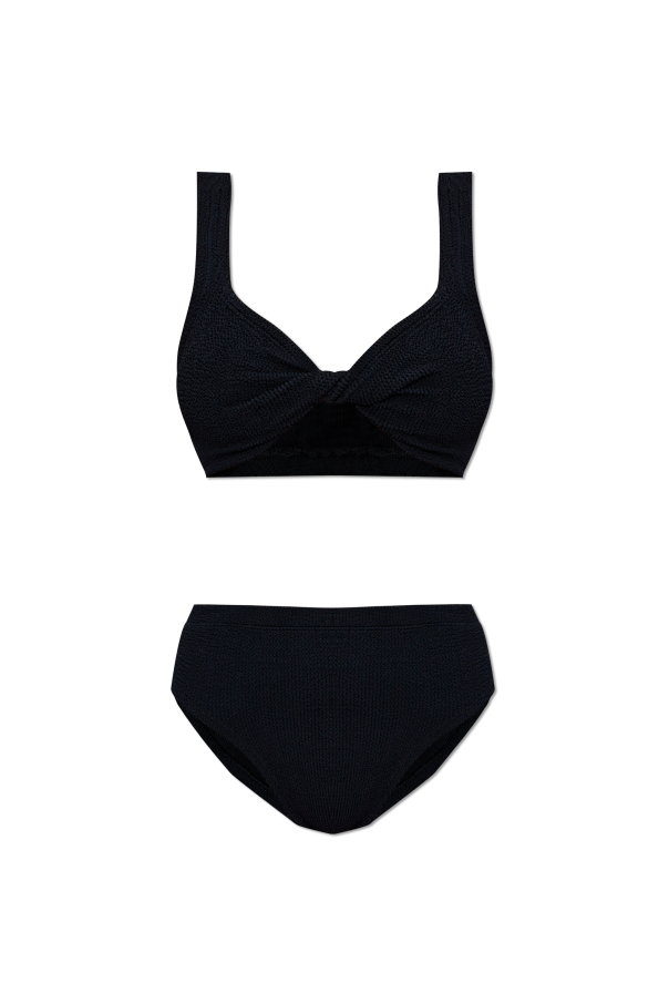 Introducing the exquisite Jamie Two-Piece Swimsuit by the renowned designer Hunza G. This black masterpiece epitomizes both elegance and modernity, crafted for the discerning fashion connoisseur. The top features broad straps and artfully crossed cups that culminate in a central knot, bestowing a touch of sophistication. Its textured fabric not only enhances its unique appearance but also exudes a sense of refined luxury. The high-waisted bottoms are designed to accentuate the waistline while ensuring unparalleled comfort. They mirror the top\'s textured allure, creating a harmonious ensemble. Why choose this product? Timeless elegance with a contemporary twist. Designed by the iconic Hunza G, celebrated for its stylish swimsuits. Constructed from seamless, body-sculpting fabric. Universal appeal, suitable for various body types.